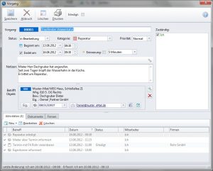 Trotzdem ist es in manchen Fällen erforderlich, alle zu einem Vorgang eingegebenen Daten auch ausdrucken zu können. Ein Kunde benötigte beispielsweise wegen eines Rechtsstreits Vorgangsdaten aus dem Objektmanagement-Modul in Papierform. Wir haben deshalb in das Stammdaten-Fenster des Vorgangs einen Drucken-Schalter eingebaut. Im Ausdruck werden neben den Stammdaten des Vorganges auch die Aktivitäten aufgelistet. Aufgaben, Termine und Anrufe werden mit den dazugehörigen Notizen gedruckt.